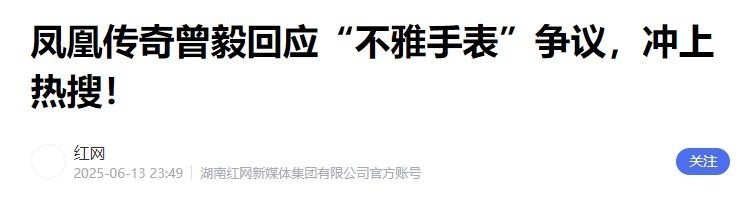 参考文献:1.大皖新闻:《劳力士店员否认曾毅所戴手表为自家品牌》2025-06-14 2.中华网:《他常年呦呦呦,她却声嘶力竭,五五平分亿元收入,凤凰传奇为什么如此一直坚持》2017-06-26 3.搜狐娱乐:《凤凰传奇成都演唱会宣布取消此前已连续取消两站演出》2025-07-07 4.红网:《风凰传奇曾毅回应“不雅手表”争议,冲上热搜!》2025-06-13