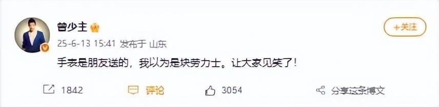 面对压力,曾毅出面解释称手表系朋友所赠,自己误以为是劳力士品牌,纯属误会。
