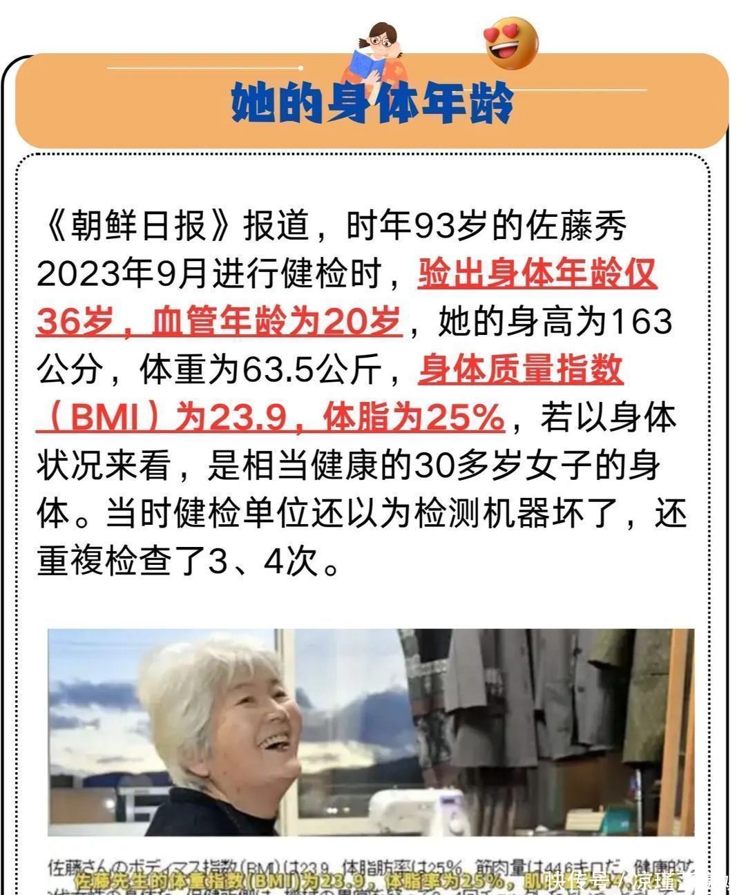 可对于佐藤秀奶奶而言,这些烦恼与焦虑几乎约等于“零”。因为保养得当,她的身体就像被岁月按了暂停键,虽然头发变白了,身材走样了,但面容依旧红润,身姿依旧挺拔,眼神明亮、动作灵活,完全看不出是一位即将百岁的老人。>>2、身体数值大公开,惊掉你的下巴容貌显年轻已经难得,最可贵的是佐藤秀奶奶的身体更是年轻。据《朝鲜日报》报道,二三年九月,佐藤秀奶奶进行身体健康检查时,验出身体年龄只有36岁,血管年龄更是比绝大多数年轻人还要好,仅仅只有20岁!而佐藤秀奶奶身高1米63公分,体重63.5kg,身体质量指数(BIM)为23.9,体脂为25%,各种身体指标完全健康!